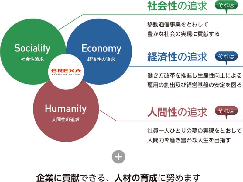 企業理念であります、人間性の追求(社員一人ひとりの夢の自己実現をとおして人間力を磨き豊かな人生を目指し、企業に貢献できる人材の育成に努めます)、社会性の追求(移動通信事業をとおして豊かな社会の実現に貢献します)、経済性の追求(働き方改革を推進し生産性向上による雇用の創出及び経営基盤の安定を図ります)を信条として経営してまいります。